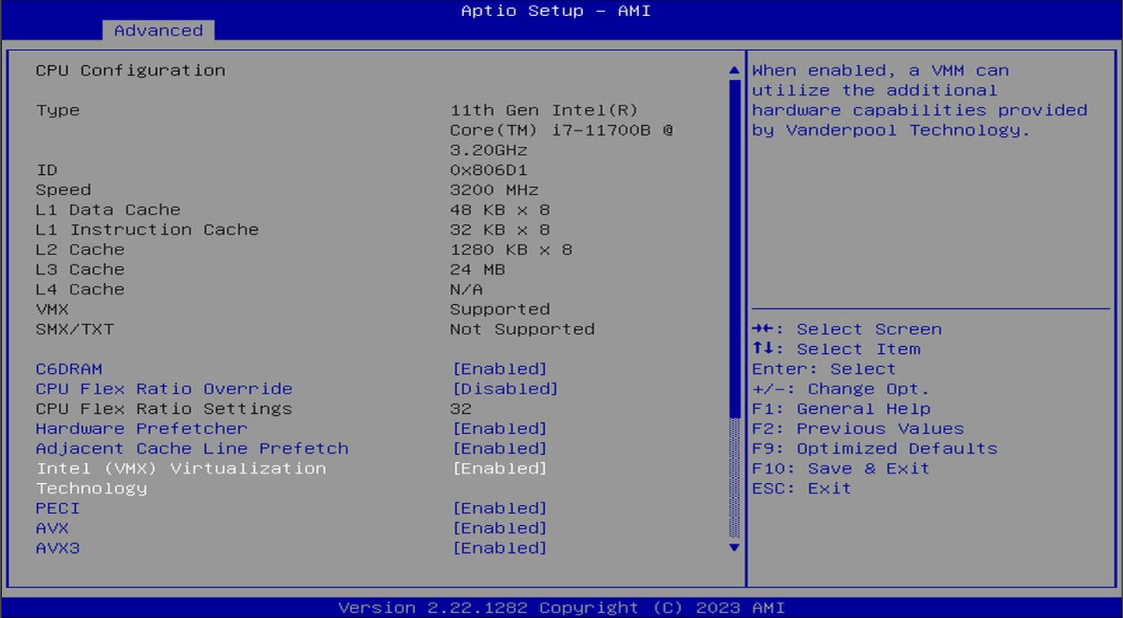 Advanced -> CPU Configuration -> Intel (VMX) Virtualization Technology -> Enabled