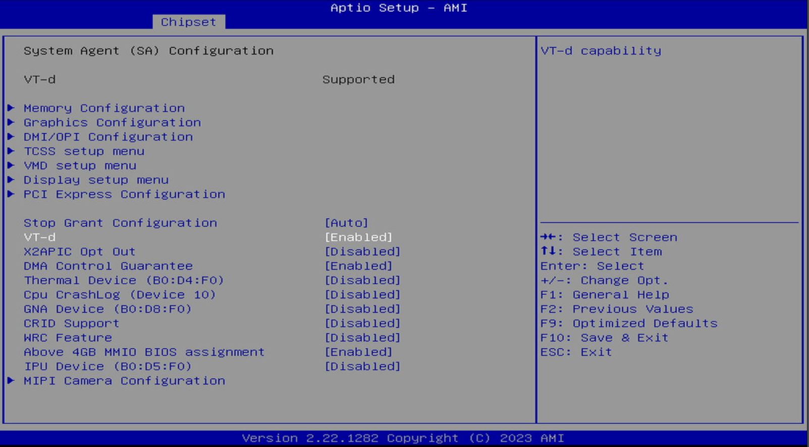 Chipset -> System Agent (SA) Configuration -> VT-d -> Enabled
